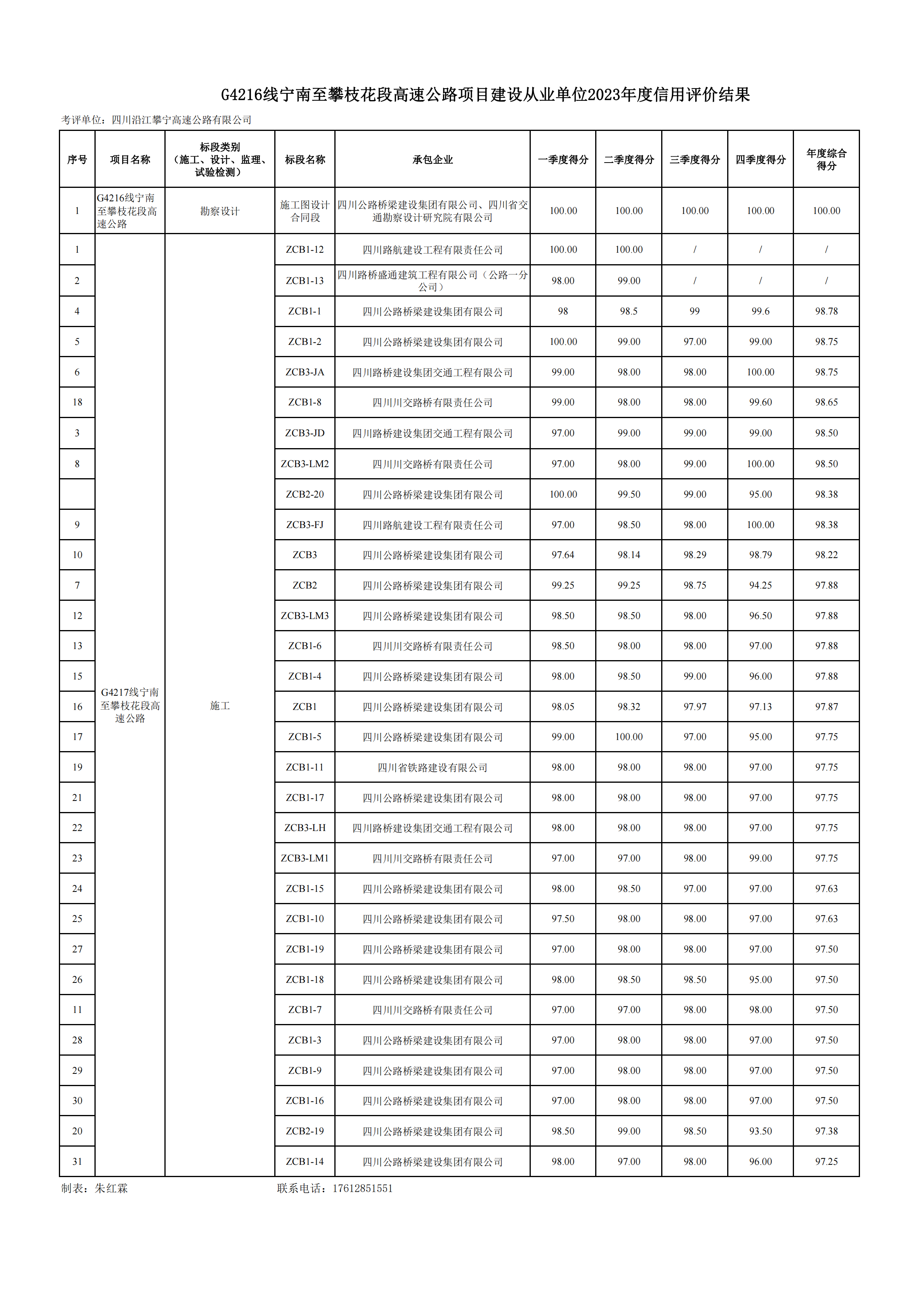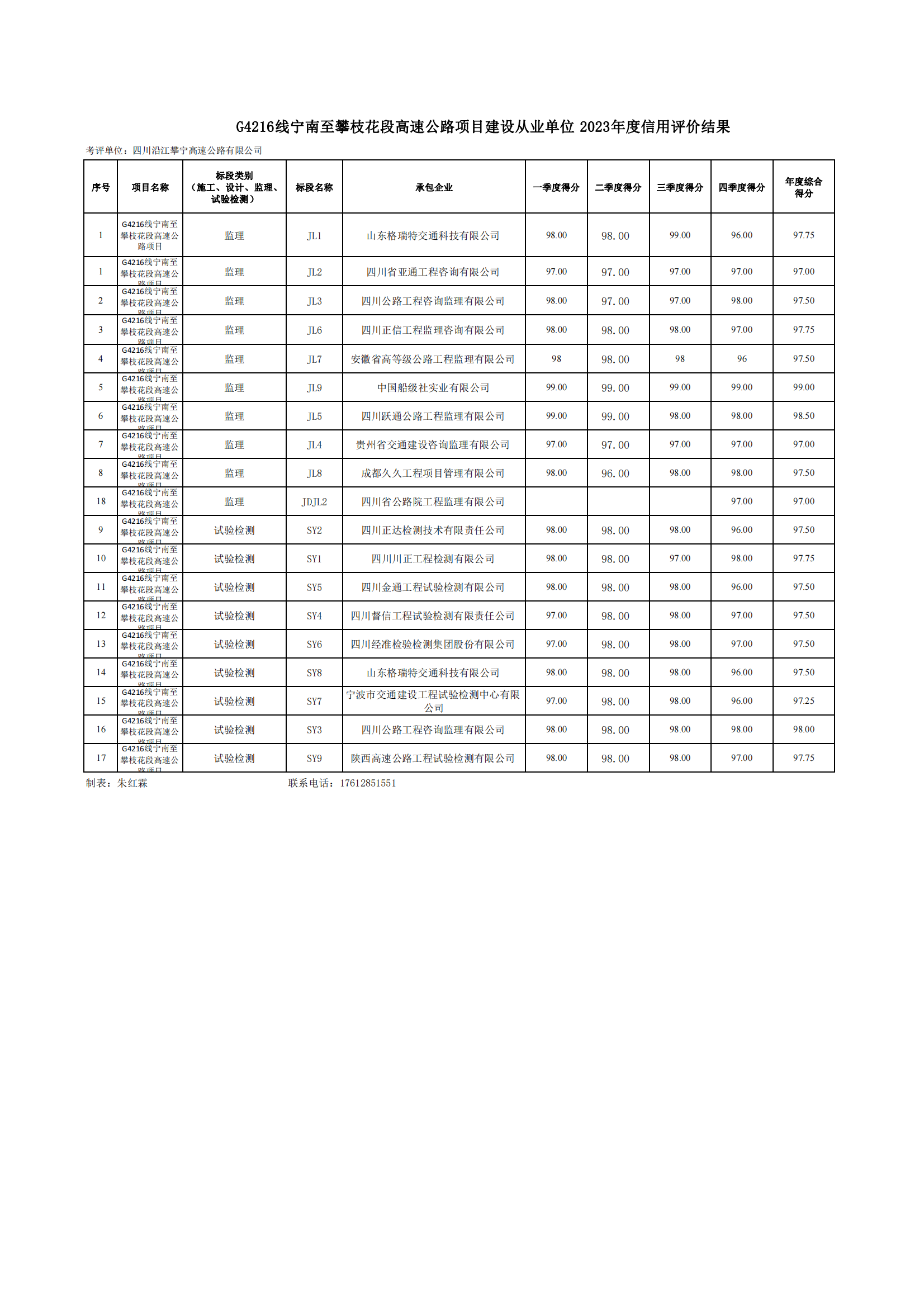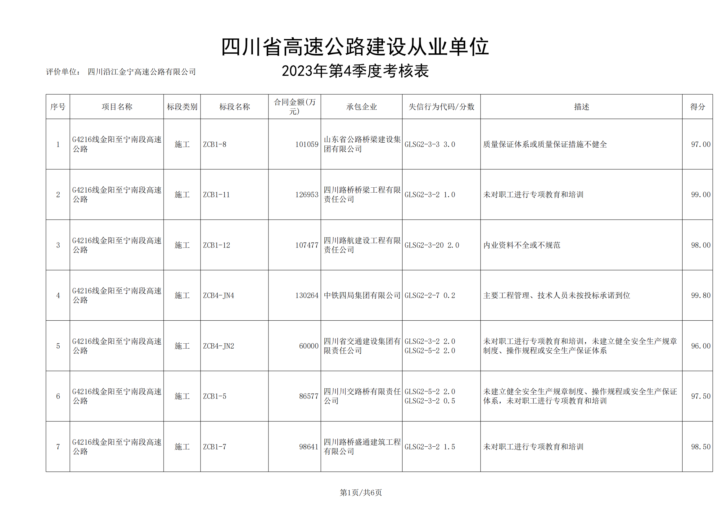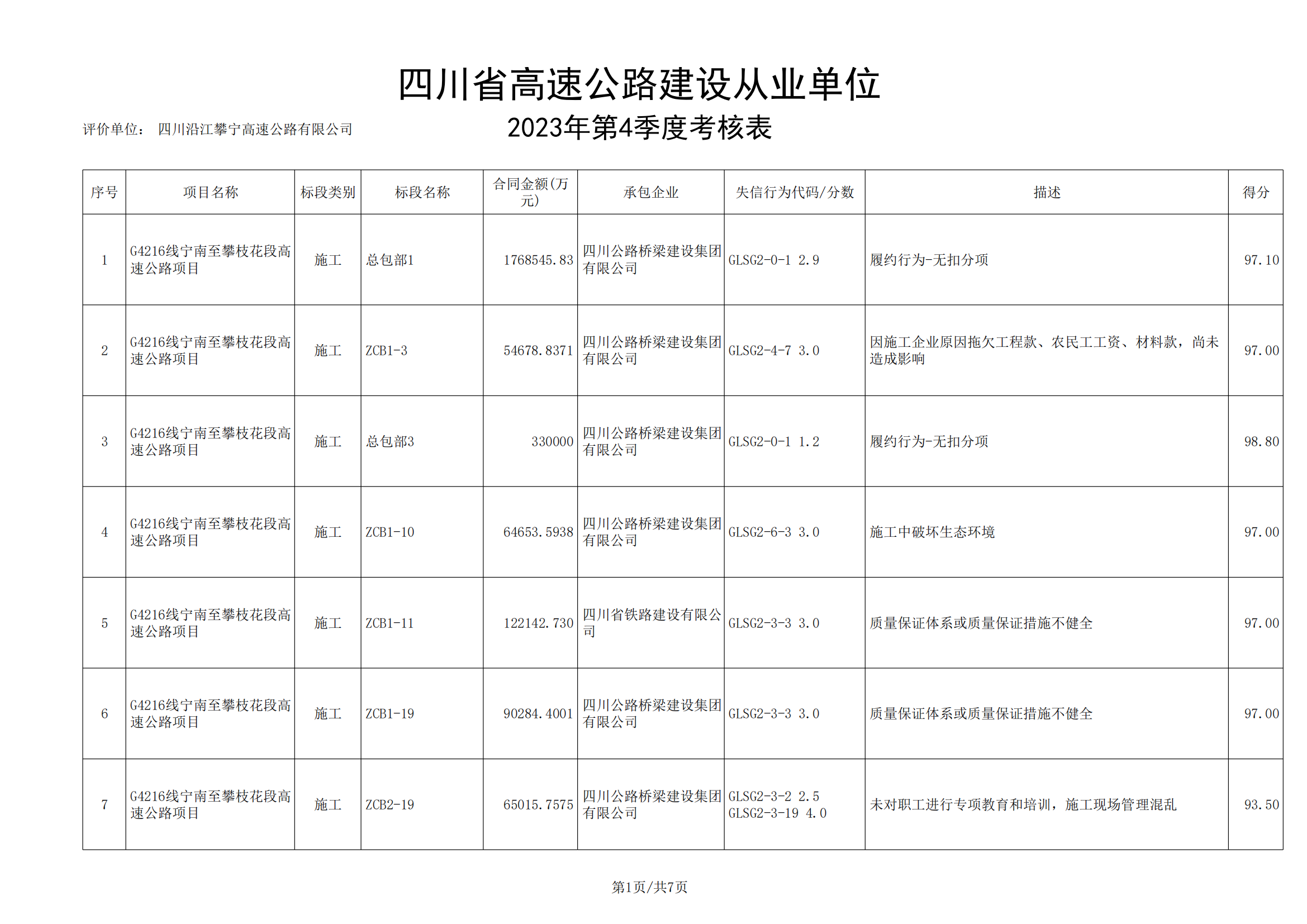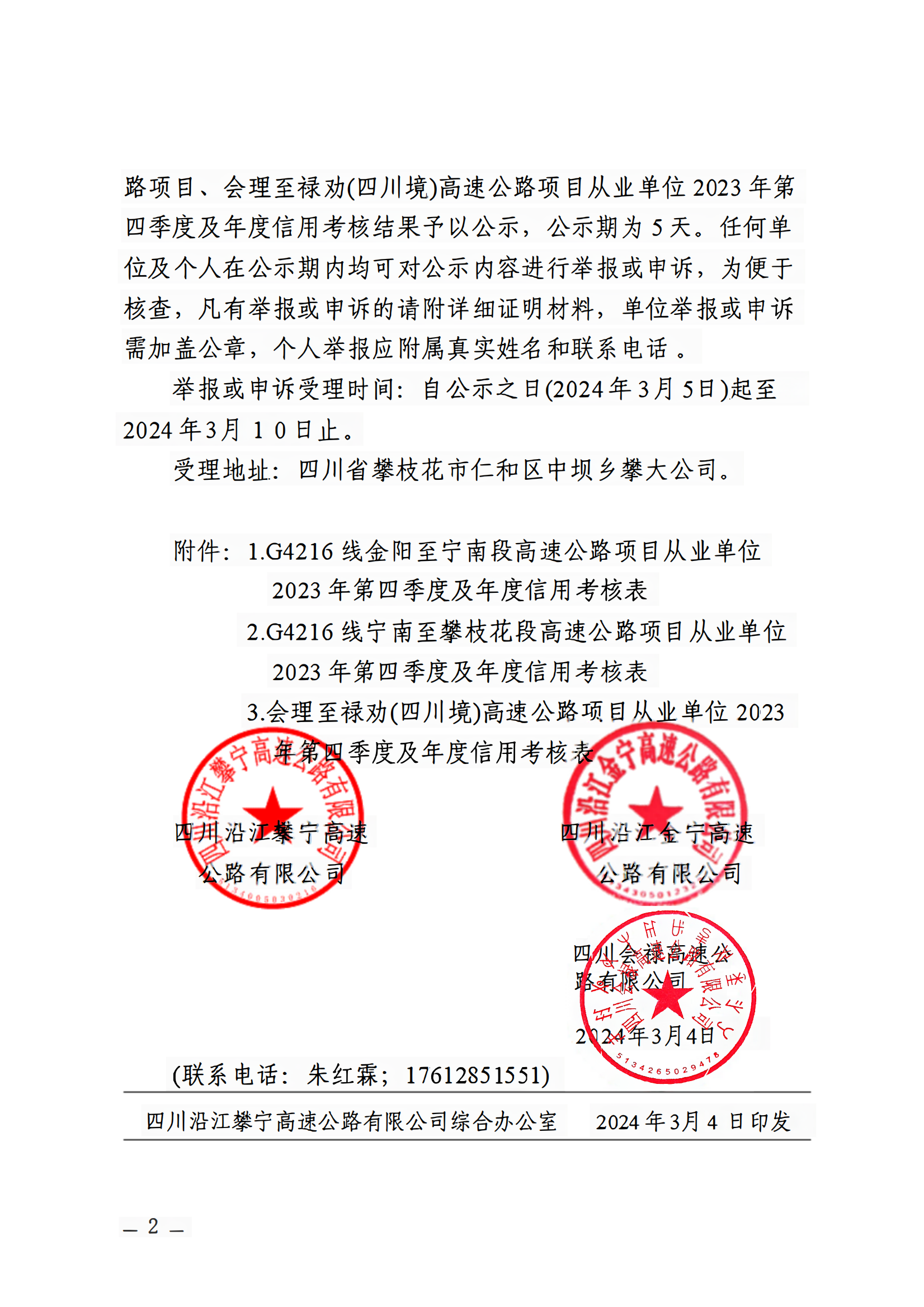 四川沿江攀寧高速公路有限公司 四川沿江金寧高速公路有限公司 四川會祿高速公路有限公司 關于從業單位2023年第四季度及年度信用考核結果公示的通知