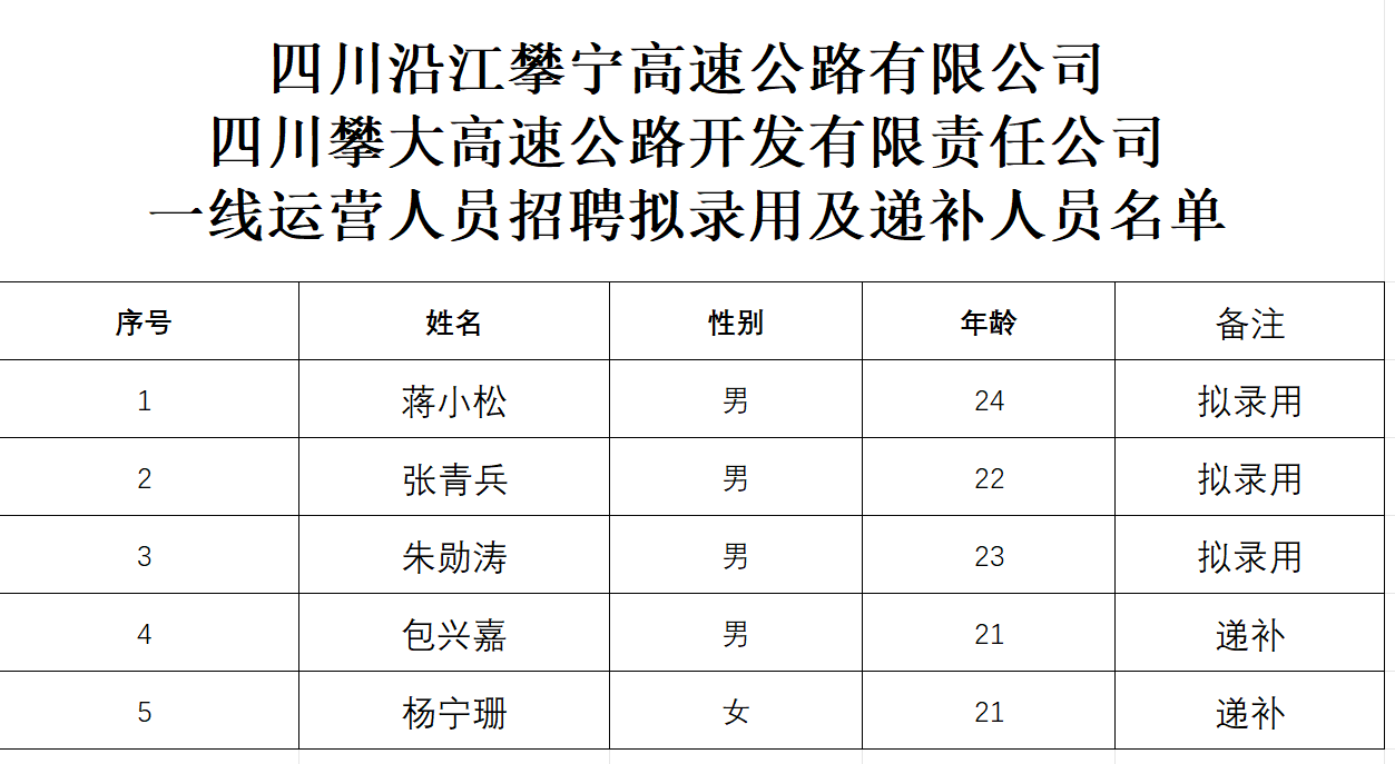 依據《攀寧攀大公司一線運營人員招聘公告》要求,現將擬錄用及遞補人員名單進行公示,名單詳見附件。